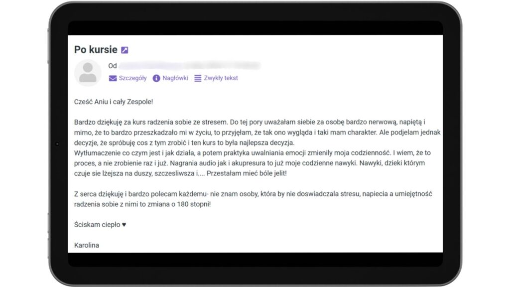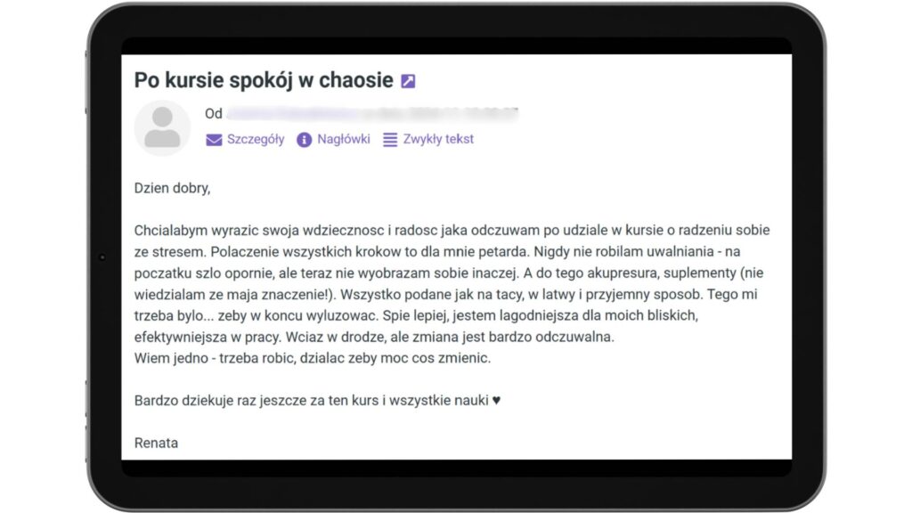 Chciałabym wyrazić swoja wdzięczność i radość, jaka odczuwam po udziale w kursie o radzeniu sobie ze stresem. Połączenie wszystkich kroków to dla mnie petarda. Nigdy nie robiłam uwalniania – na początku szlo opornie, ale teraz nie wyobrażam sobie inaczej. A do tego akupresura, suplementy (nie wiedziałam ze maja znaczenie!). Wszystko podane jak na tacy, w łatwy i przyjemny sposób. Tego mi trzeba było… żeby w końcu wyluzować. Spie lepiej, jestem łagodniejsza dla moich bliskich, efektywniejsza w pracy. Wciąż w drodze, ale zmiana jest bardzo odczuwalna.
